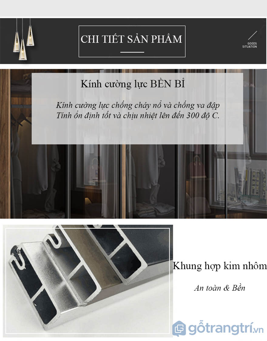 Sản phẩm của chúng tôi được sản xuất với công nghệ cao chất liệu gỗ công nghiệp cao cấp MDF, đảm bảo an toàn cho bạn và gia đình. Với cửa lùa bằng kính trong suốt, bạn có thể dễ dàng nhìn thấy và lựa chọn trang phục một cách thuận tiện.