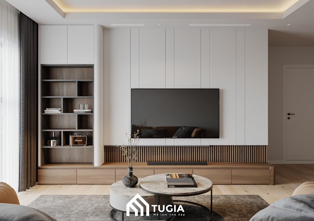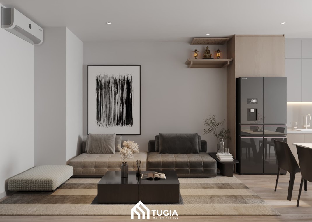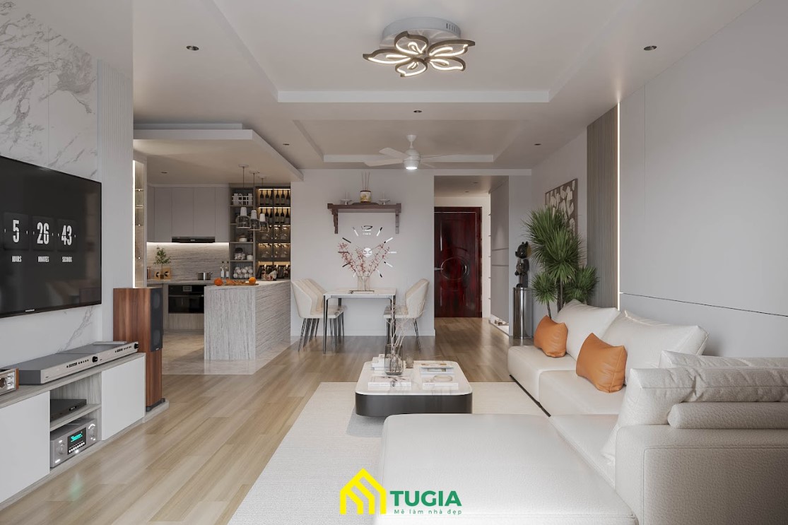 -> Nội thất Tứ Gia thiết kế nội thất chung cư 2 phòng ngủ phong cách Hiện đại thu hút với tone màu trắng kem sang trọng